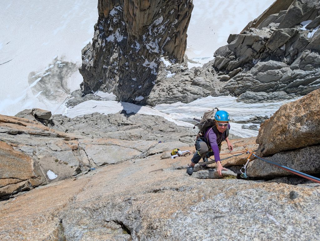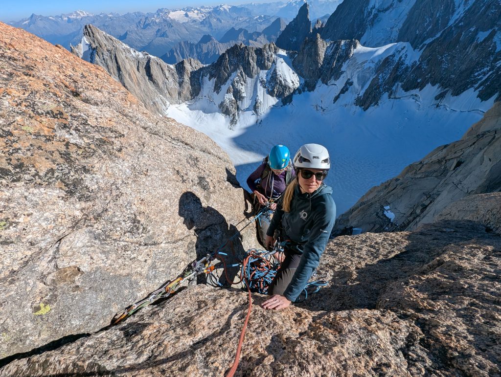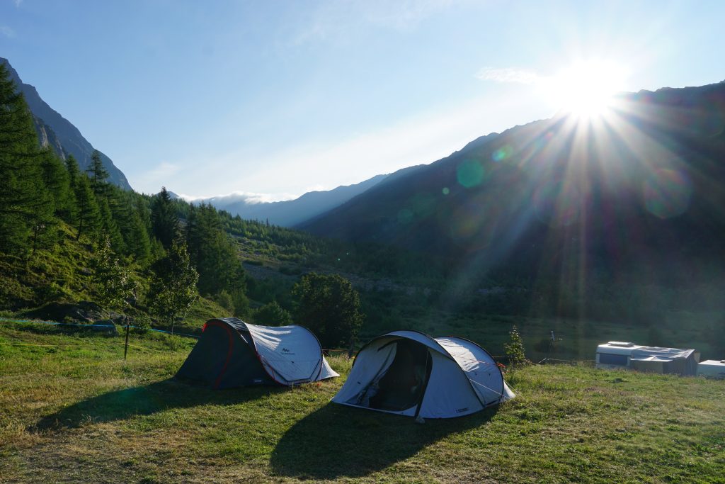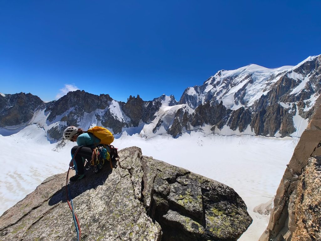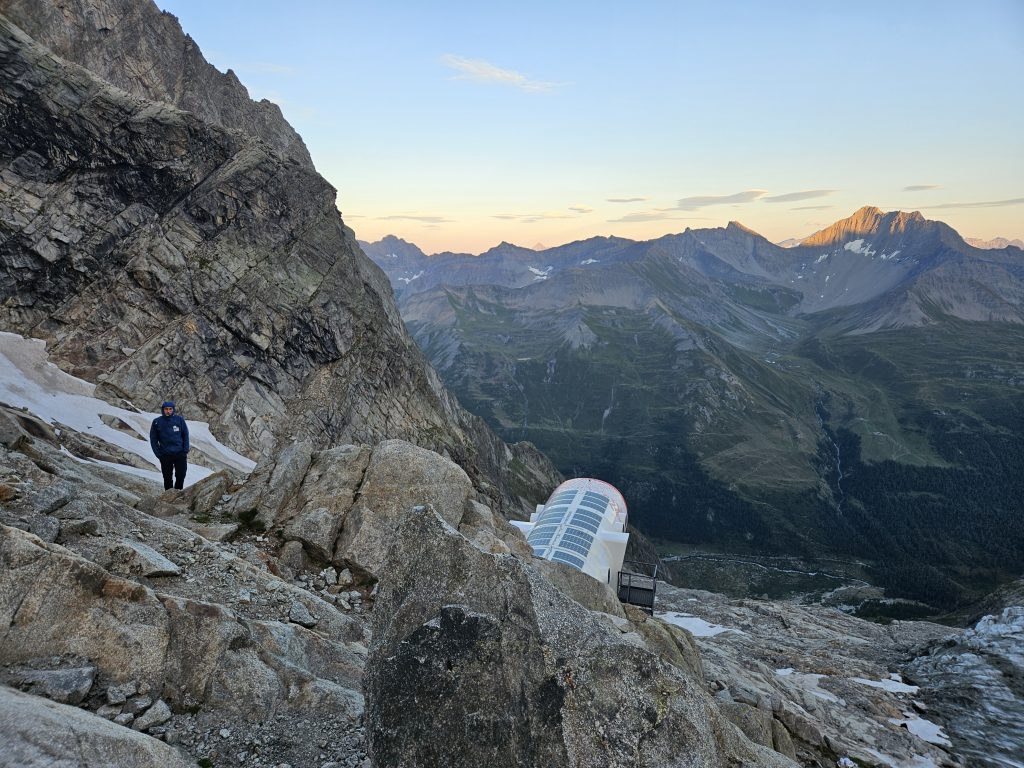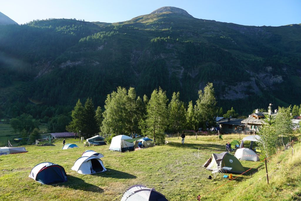 Prebudili smo se v sveže nedeljsko jutro z razgledom na dolino Val Ferret, kjer smo z najvišjo teraso v kampu imeli dober pregled nad dogajanjem. Sledila je jutranja kavica in brskanje idej za uvodni dan. S Klaro sva se odločila za športno plezanje na Mont Chetif, ki nudi veliko športnih in večraztežajnih navrtanih smeri. Sonce naju je z občutkom grelo med plezanjem in tako sva z navdušenjem iskala dobre oprimke v granitni skali s pogledom na dolino Val Veny in zasnežene vrhove Mont Blanca.