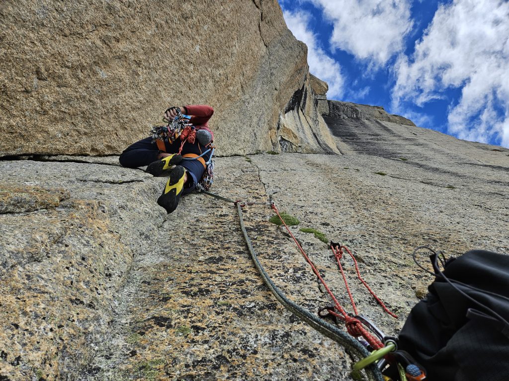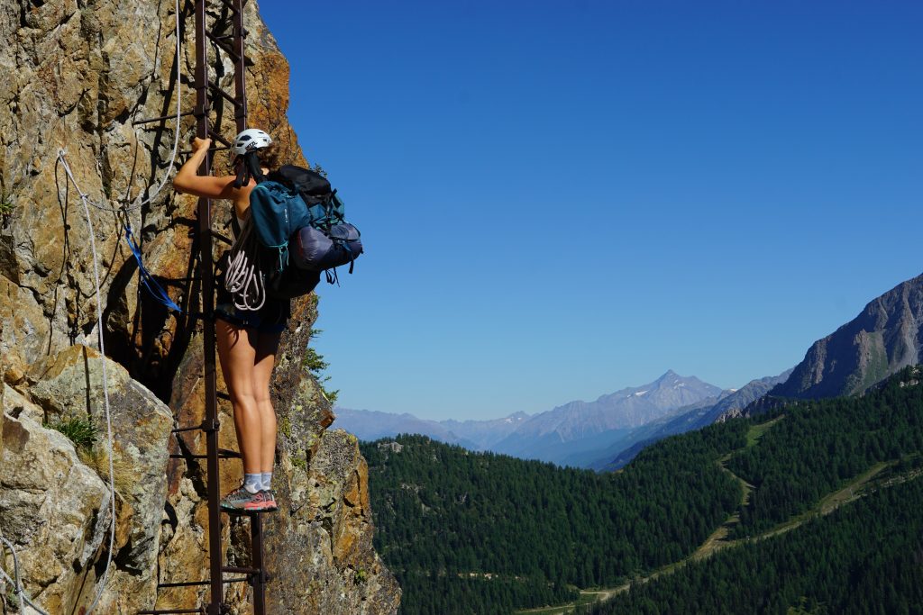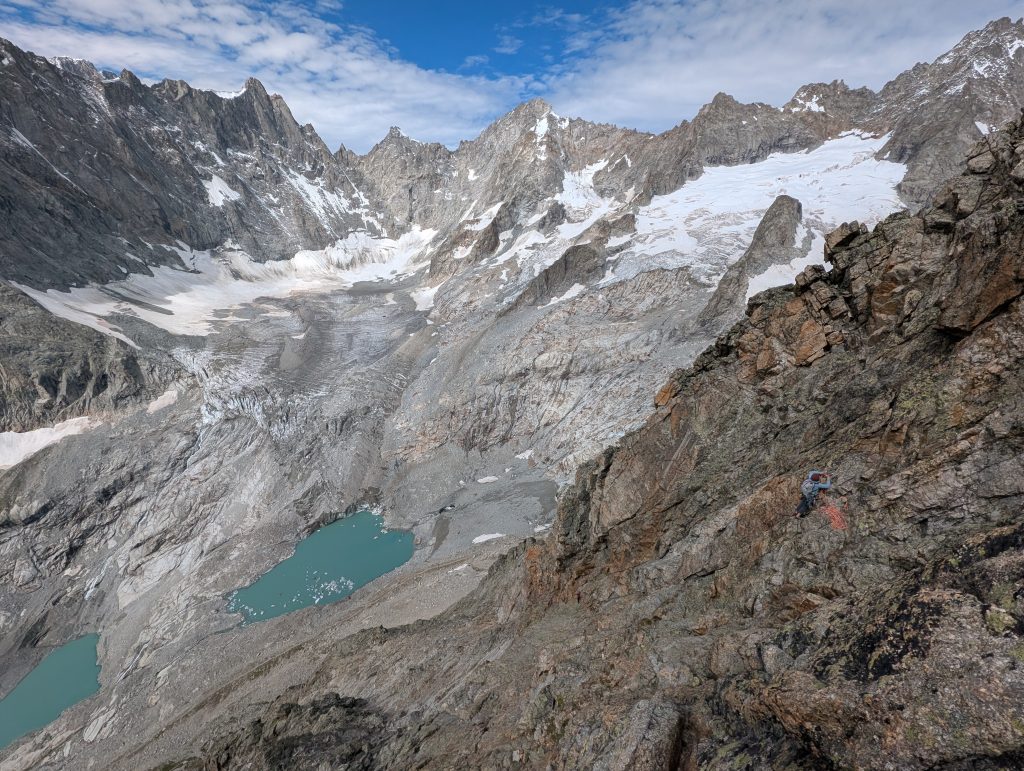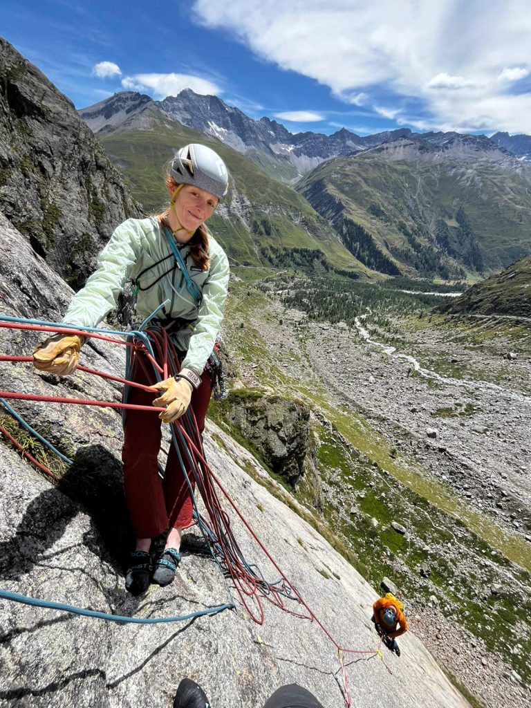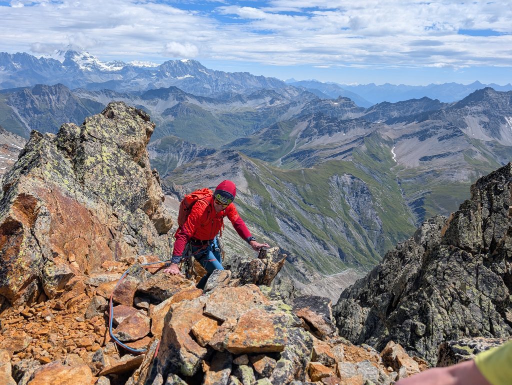 Prebudili smo se v sveže nedeljsko jutro z razgledom na dolino Val Ferret, kjer smo z najvišjo teraso v kampu imeli dober pregled nad dogajanjem. Sledila je jutranja kavica in brskanje idej za uvodni dan. S Klaro sva se odločila za športno plezanje na Mont Chetif, ki nudi veliko športnih in večraztežajnih navrtanih smeri. Sonce naju je z občutkom grelo med plezanjem in tako sva z navdušenjem iskala dobre oprimke v granitni skali s pogledom na dolino Val Veny in zasnežene vrhove Mont Blanca.