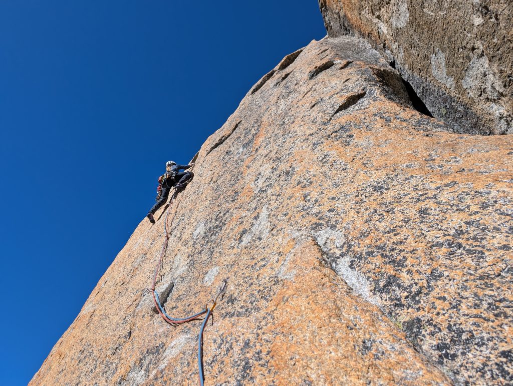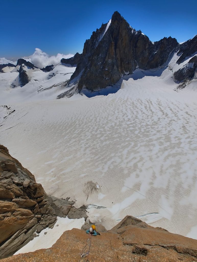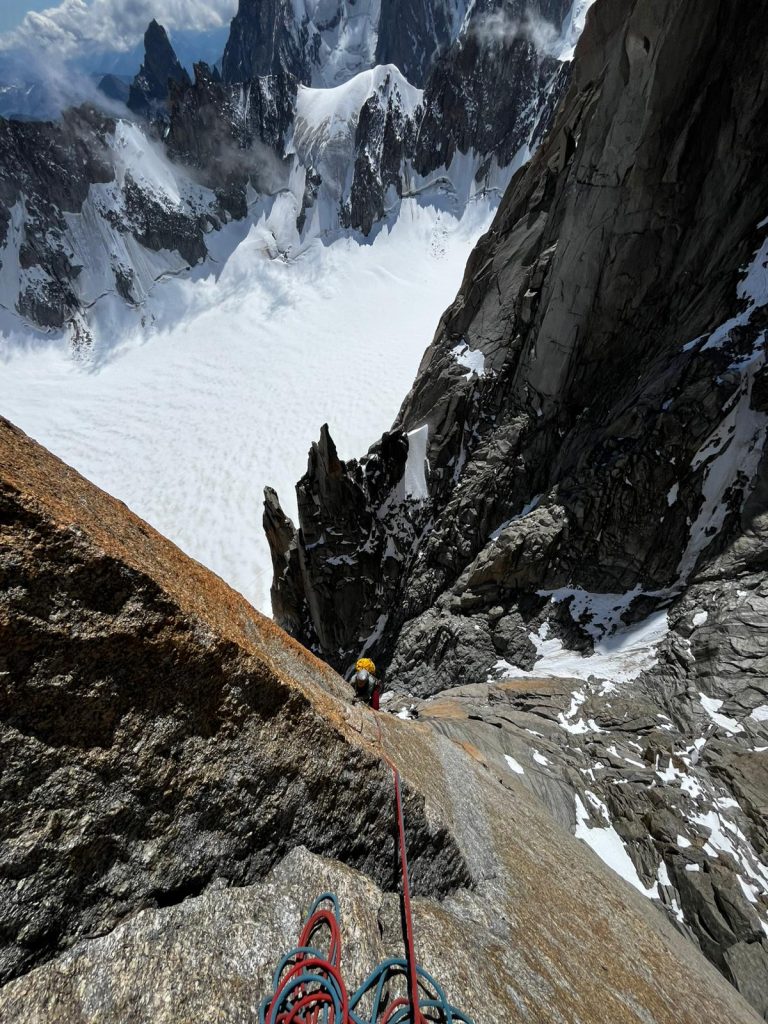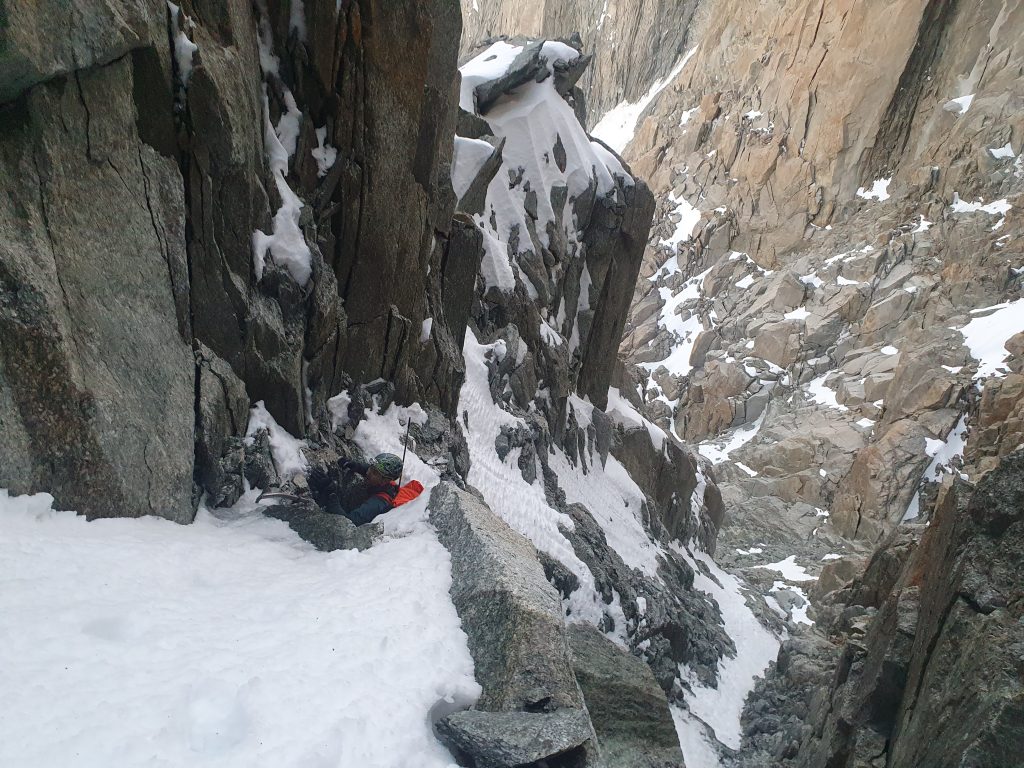 Krištof in Katarina pa sta imela bolj ambiciozne načrte že v prvih dneh. Odpravila sta se proti bivaku Gervasutti in tam na izjemnem kraju za občudovanje razgledov izjemne skalne kulise prenočila kar dvakrat. Plezala sta smer Bonatti-Mazeaud v steni Petites Jorasses.