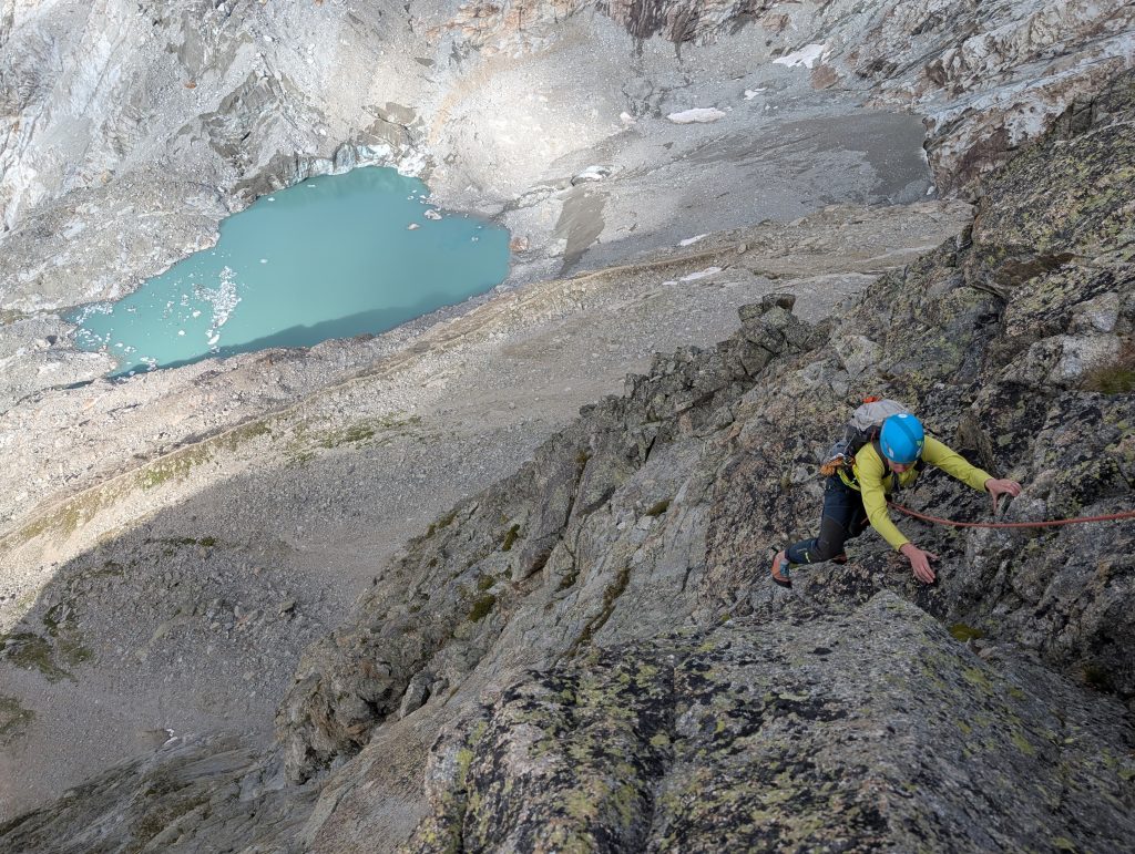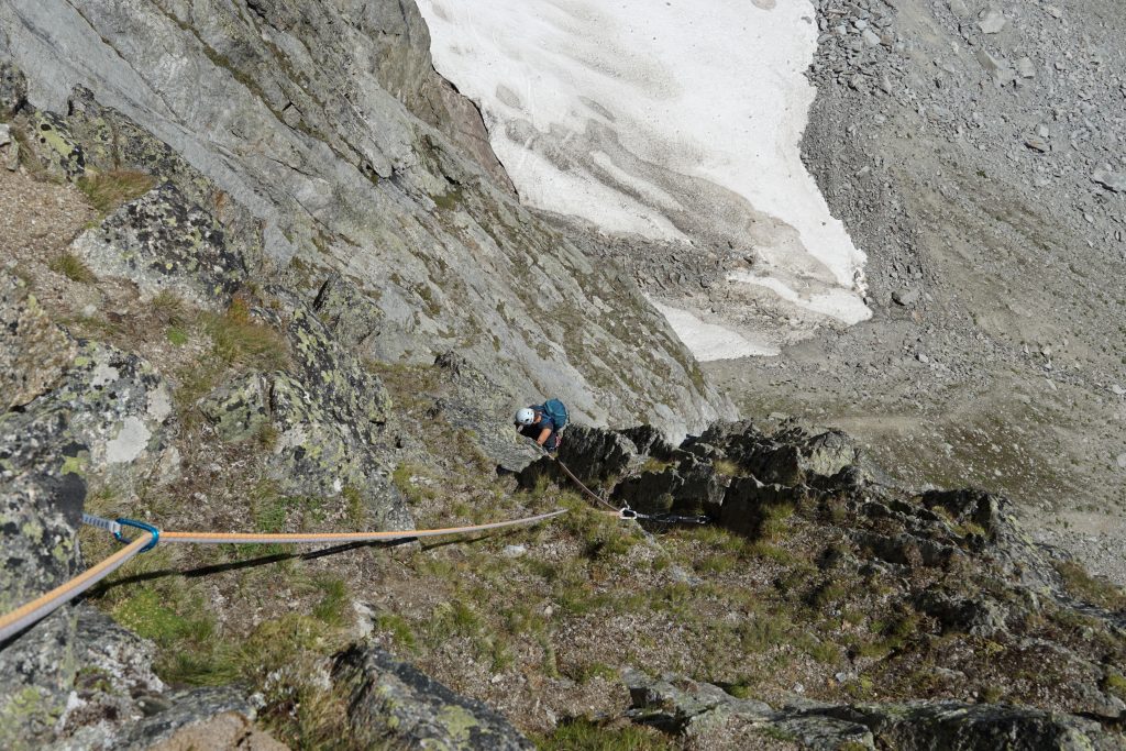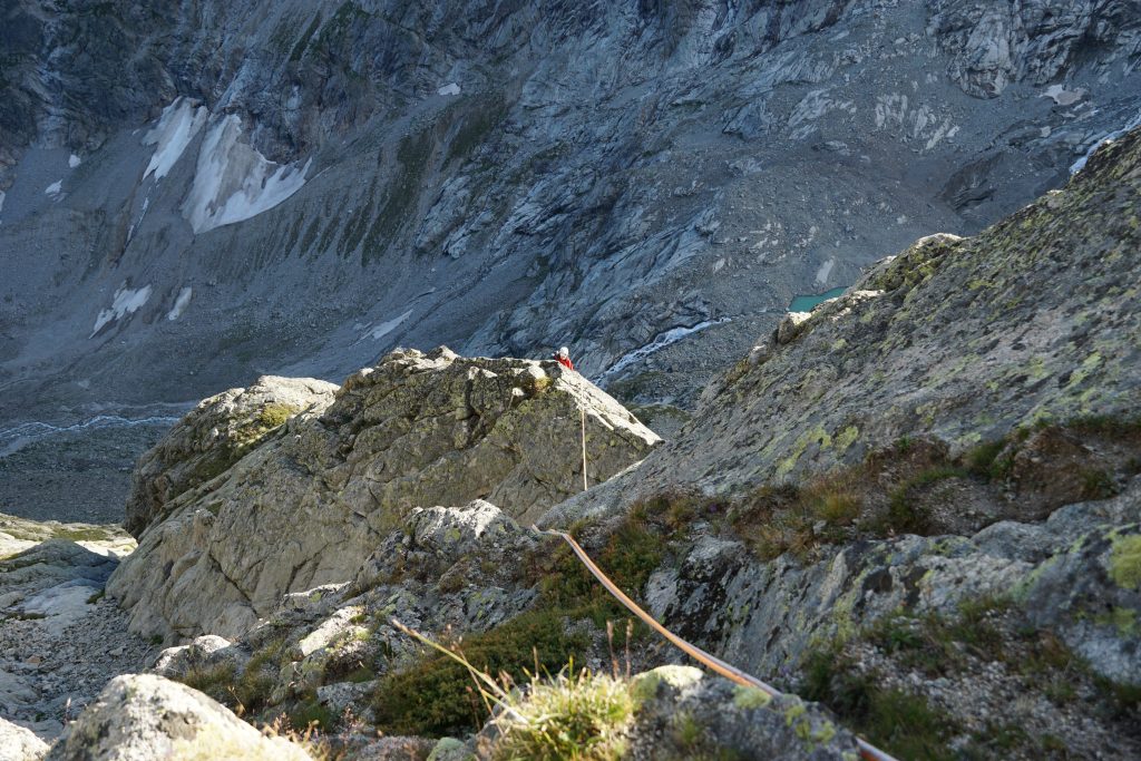 V petek sva se naspana odpravila po melišču navzgor proti prvi skalni špici južnega grebena, ki vodi na Aiguille Noire de Peuterey. Ob vstopu v smer Bellasvista (5a/5a, 400m) naju pozdravi jutranje sonce in se naveževa na oranžno in sivo vrv. Klara gre prve raztežaje in lepo napredujeva začetne metre. Nato pa prideva do krušljivih skal, ki so zasidrave v travnate poličke, kar nama vrame precej časa za vstavljanje varoval. Po 12 urah plezanja se odločiva za spust po vrvi, čeprav sta nama do vrha ostala le dva raztežaja. Ko sem prižgal naglavno svetilko sva bila že pri zadnjem sidrišču za spust in bila sva pomirjena, ko sva se ob polni luna razvezala in s previdnostjo sestopila po skalah nazaj do bivaka. Ura je kazala polnoč, ko sva prišla do najinih pojstelj in od utrujenosti zaprla oči do naslednjega jutra.