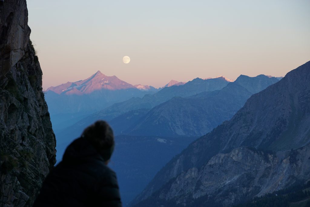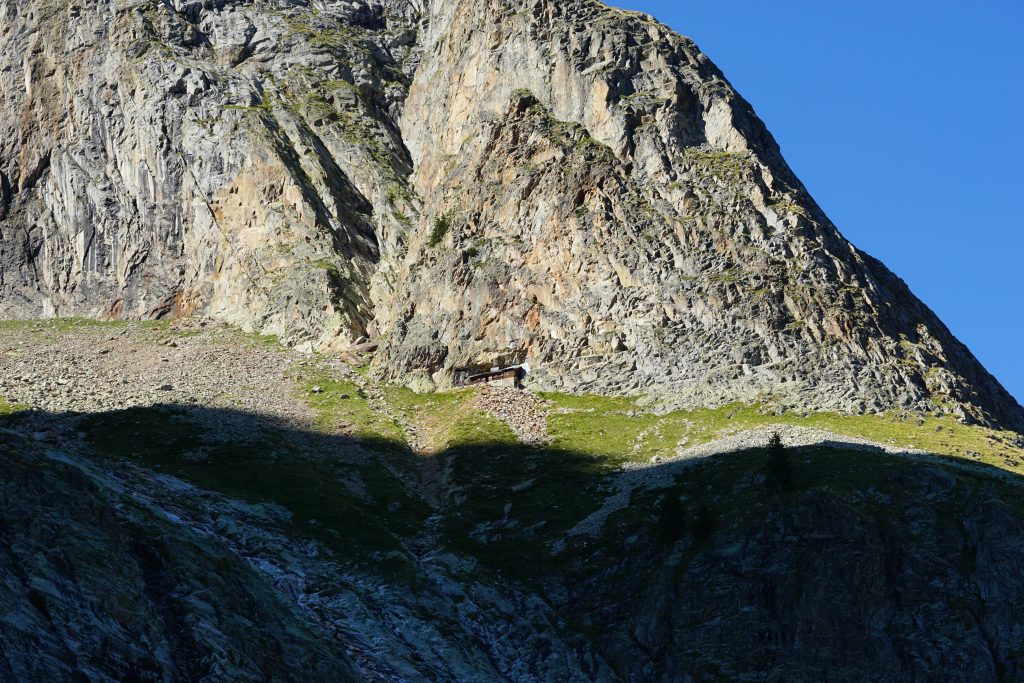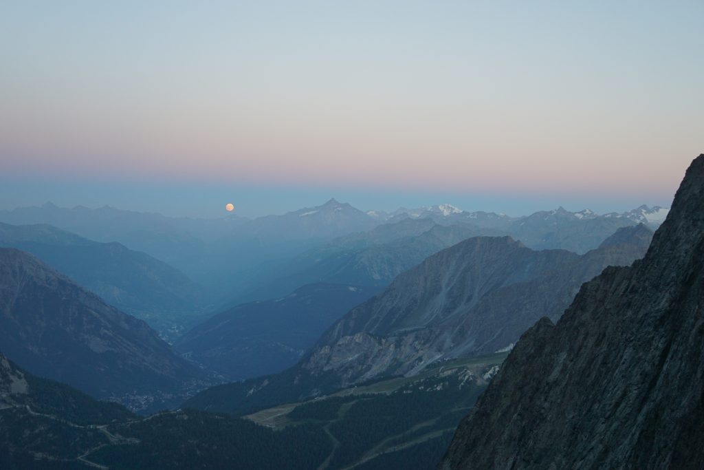 V četrtek sva se s Klaro odpravila z avtobusom v dolino Val Veny. Tam sva daleč navzgor zagledala najin cilj – Pointe Gamba 3067m. Hoja po popoldanskem soncu naju je precej utrudila, vendar je bil na srečo ob poti slap, kjer sva se lahko osvežila, tudi borovnic in brinovih jagod ob poti ni manjkalo. Presenetila naju je druga polovica poti, saj je bila pred nama dokaj izpostavljena ferata, ki pa se zdi težja, če imaš na hrbtu okoli 20kg. S previdnostjo sva nadaljevala čez dve lestvi in kmalu zagledala bivak Borelli, kjer sva prespala to noč. Ob sončnem zahodu sva se osvežila v bližnjem potoku, pričakalo luno nad Grand Paradisom in se udobno namestila v postelji, ki je bila celo bolj prijetna kakor šotor v dolini.